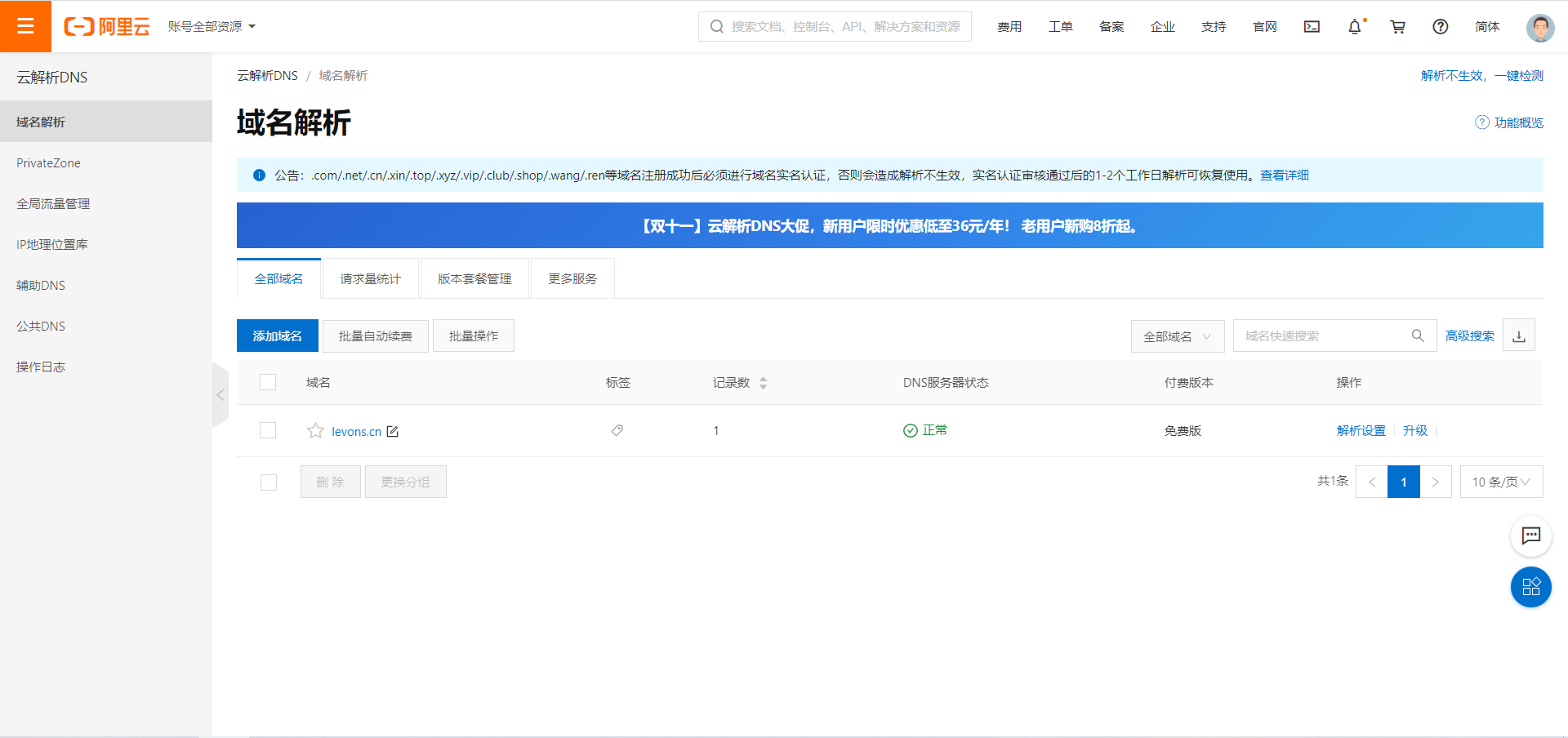 使用阿里云的免费解析,在云解析DNS/域名解析页面添加域名